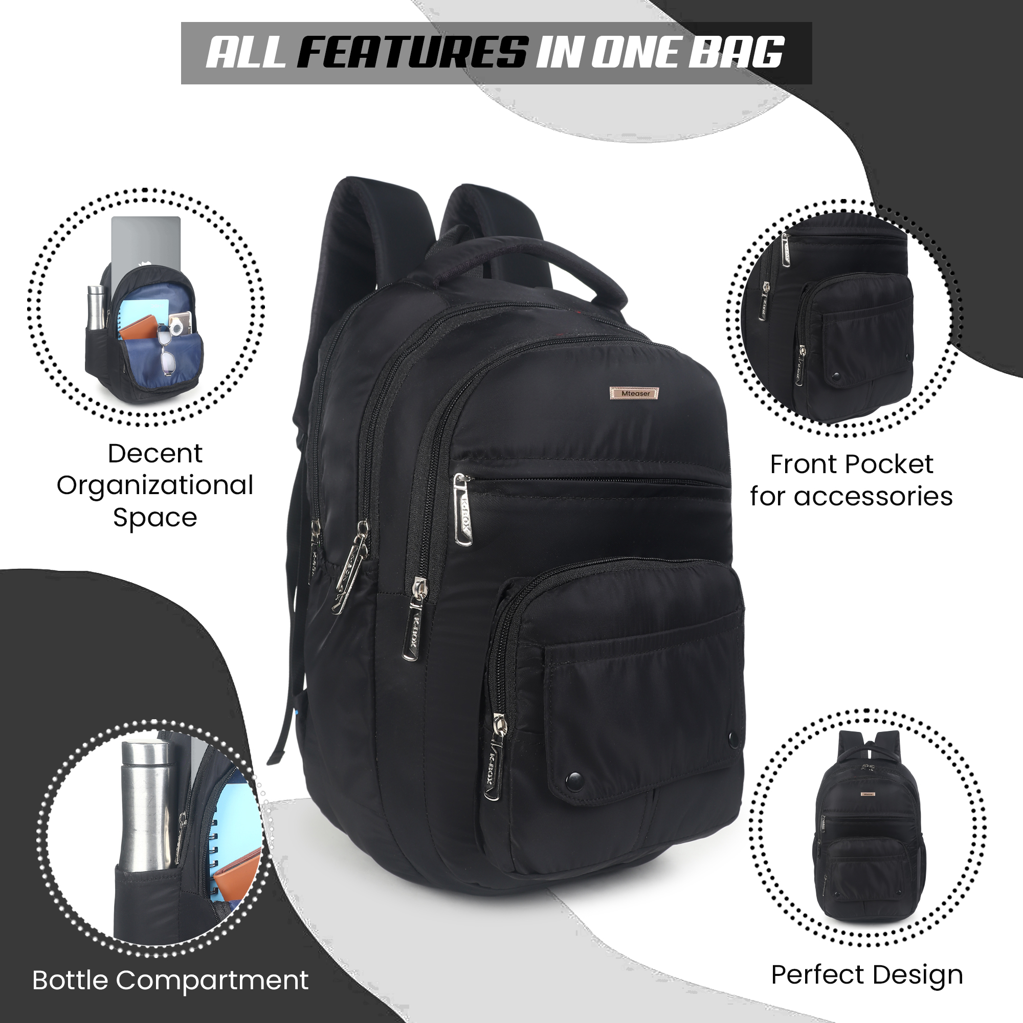 β’ Side Bottle & Front Utility Pocket β Includes a side bottle compartment and front quick-access pocket for chargers, wallet, keys, or accessories.
